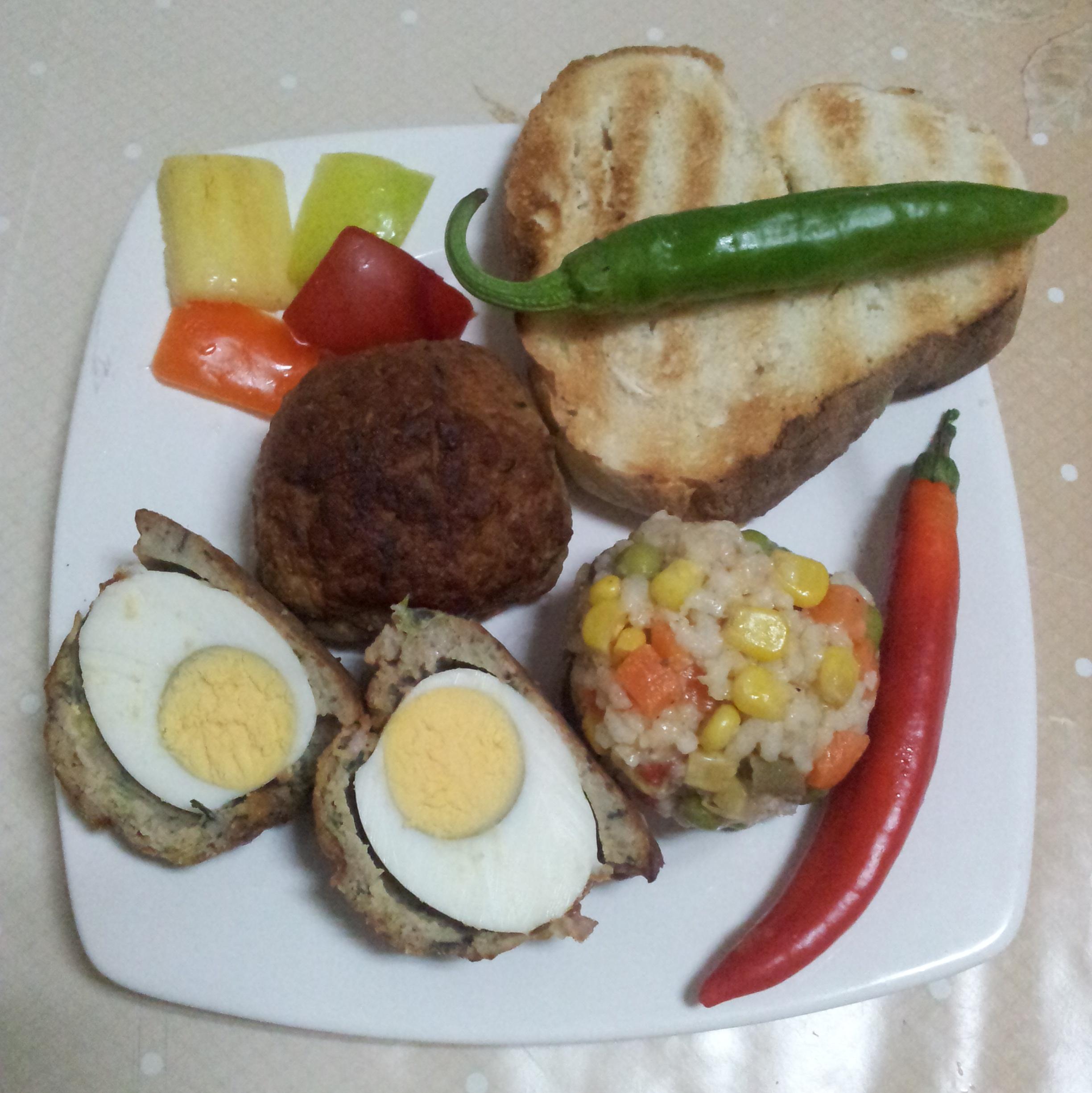 Aranjament cu tartina inima, chiftea cu ou si orez Posted on 08/19/2014 by Ingrid GAL Ingrediente: -chiftea de pui: carne, ceapa, usturoi, ou, marar, patrunjel, sare, piper, pesmet si ou fiert la mijloc -biluta de orez cu legume si porumb -tartina inima din paine prajita -ardei iute Post navigation ← Previous Next →